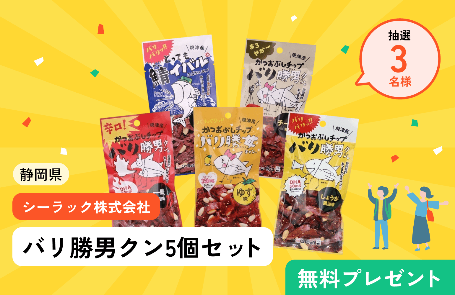 FAVTOWN会員限定で、シーラック株式会社様の『バリ勝男クン』シリーズ5袋が当たるプレゼントキャンペーン。累計30,000,000袋突破の人気かつおぶしチップスです。