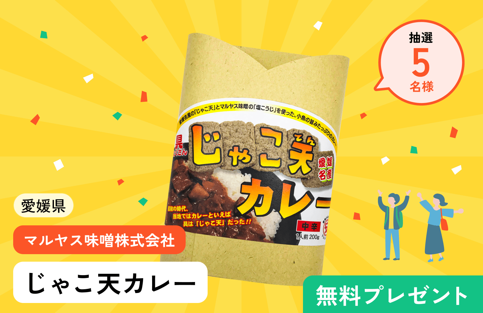 FAVTOWN会員限定で、マルヤス味噌様の『じゃこ天カレー』が当たるプレゼントキャンペーン。宇和海の名産じゃこ天を贅沢に使った、愛媛らしさ満点のご当地レトルトカレー。