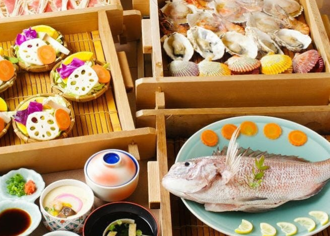 勝浦名物「鯛の姿蒸し」がついたコースに特別に「特大マグロのカマ焼き」を追加した特別なプランです。