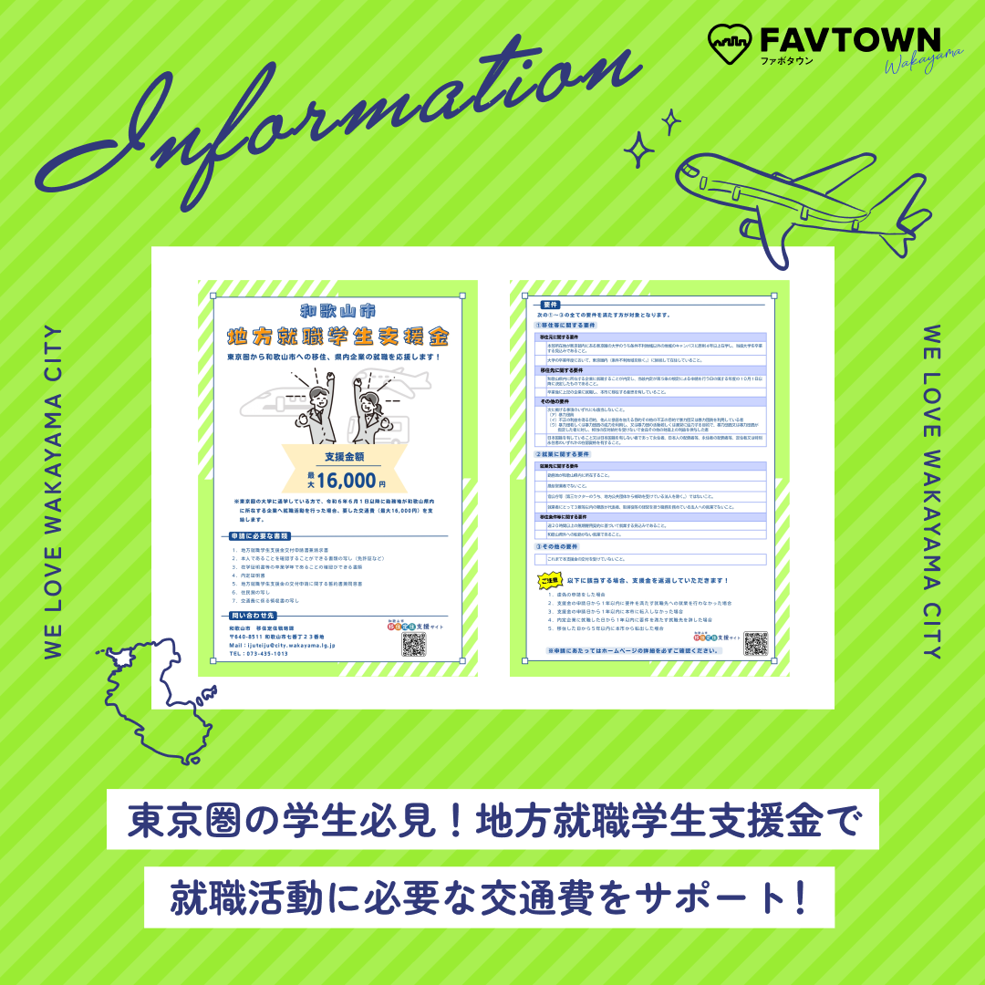 東京圏の大学を卒業予定である学生が和歌山市に移住し、和歌山県内の企業に就職する場合に、 |